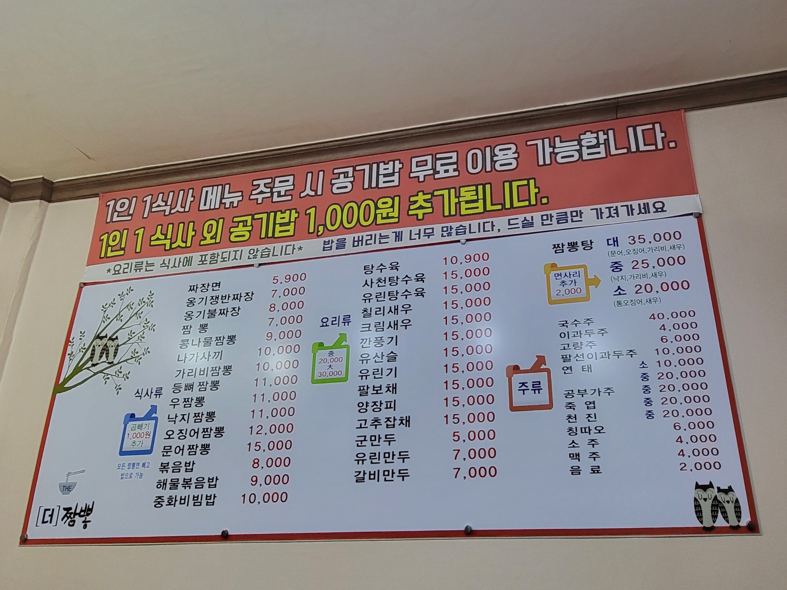 더짬뽕은 가격이 굉장히 저렴한 편입니다. 기본 짜장면 5,900원, 짬뽕 7,000원, 탕수육 10,900원으로 부담 없이 식사할 수 있어요. 곱배기로 주문하면 1,000원이 추가되며, 1인 1식사 메뉴 주문 시 공기밥은 무료로 제공되고 무한리필이 가능하다는 점도 매력적입니다.