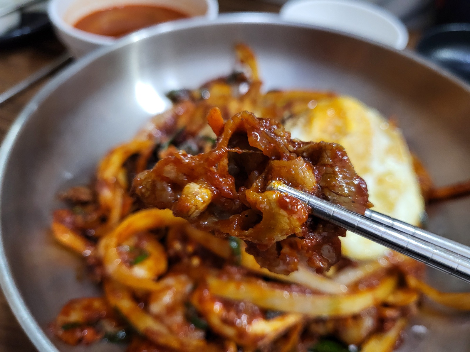 이번 방문에서 가장 기대했던 메뉴는 바로 등뼈짬뽕이었어요! 국물에 커다란 등뼈가 두 개나 들어가 있어서 비주얼부터 압도적이었습니다. 처음에는 짬뽕국물에 등뼈가 들어가면 국물이 텁텁하거나 느끼하지 않을까 걱정했는데, 그런 느낌 전혀 없이 아주 칼칼하고 얼큰한 맛이었어요. 뼈에 붙은 고기도 부드럽고 쫄깃해서 젓가락으로 살짝 건드리기만 해도 발라질 정도였습니다. 고기 좋아하는 분들은 정말 만족하실 것 같아요!