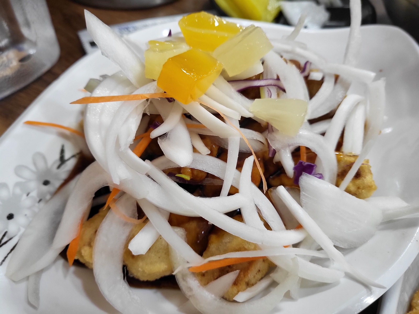 탕수육은 부먹 스타일로 제공되는데, 위에 채 썬 생양파가 올려져 있어서 특색 있었습니다.